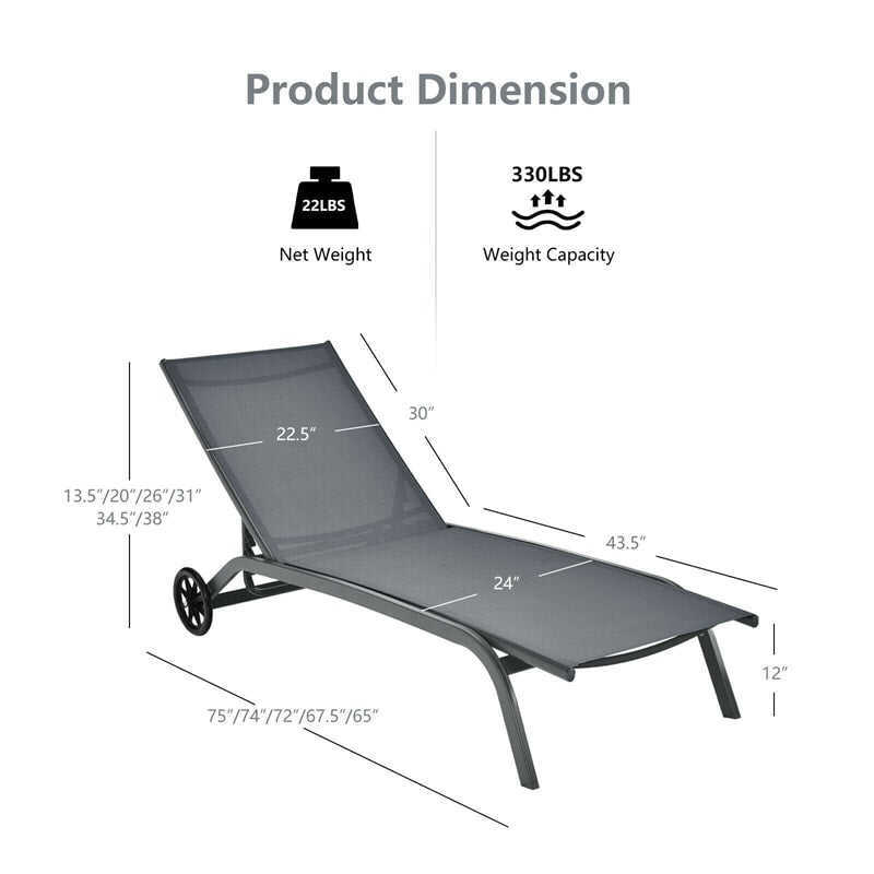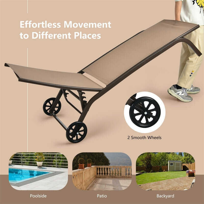 • Outdoor Chaise Lounge Chair 6-Position Adjustable Patio Recliner Chair with Wheels for Backyard Pool